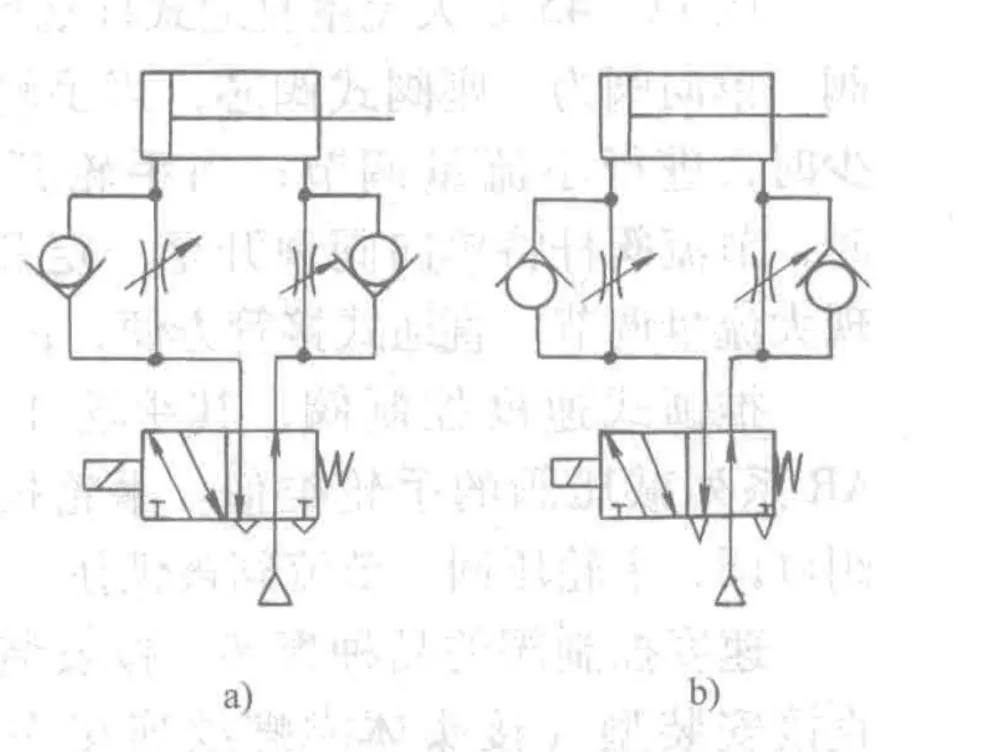 · V (b) (vstupné škrtenie) je spätný ventil na sacej strane zatvorený a spätný ventil na výfukovej strane je otvorený. Vstupný prúd vzduchu je malý, takže tlak vo vstupnej komore stúpa pomaly, zatiaľ čo tlak vo výfukovej komore rýchlo klesá. Piest sa pohybuje hlavne expanziou vzduchu, čím je regulácia rýchlosti nestabilná. Táto metóda sa zvyčajne používa len pre jednočinné valce, upínacie valce alebo valce s nízkym trením.