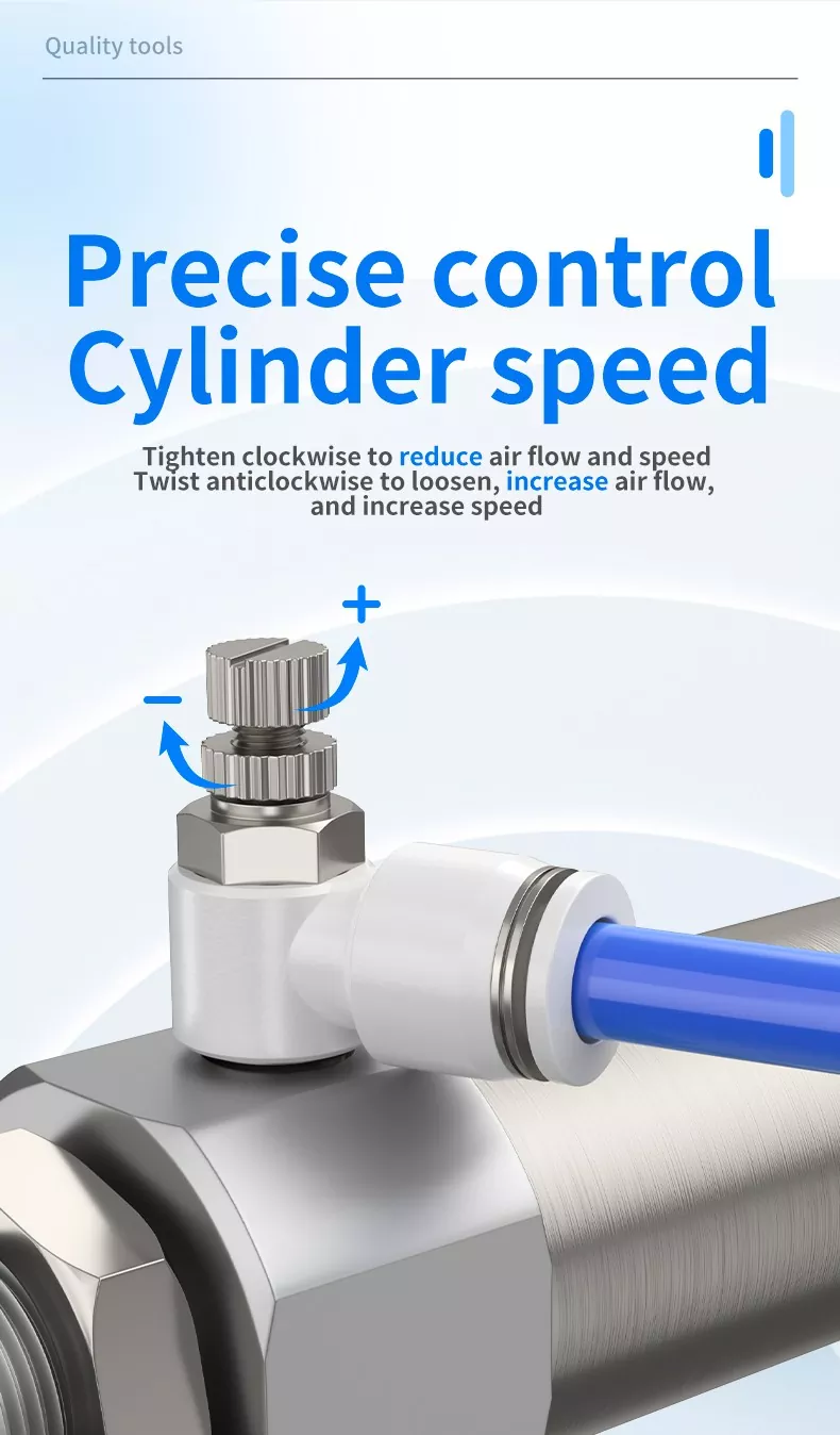 Regulátory rýchlosti sú bežné pneumatické komponenty používané na nastavenie rýchlosti vysúvania a zasúvania pohonov. Škrtiace ventily sú v podstate komponenty na úpravu prietoku, ktoré riadia rýchlosť valca, ale ich montážne polohy, smery škrtenia a konštrukcie tela sa líšia. Podľa spôsobu ovládania ich možno rozdeliť na výfukovo-škrtiaci typ a vstupný-škrtiaci typ.