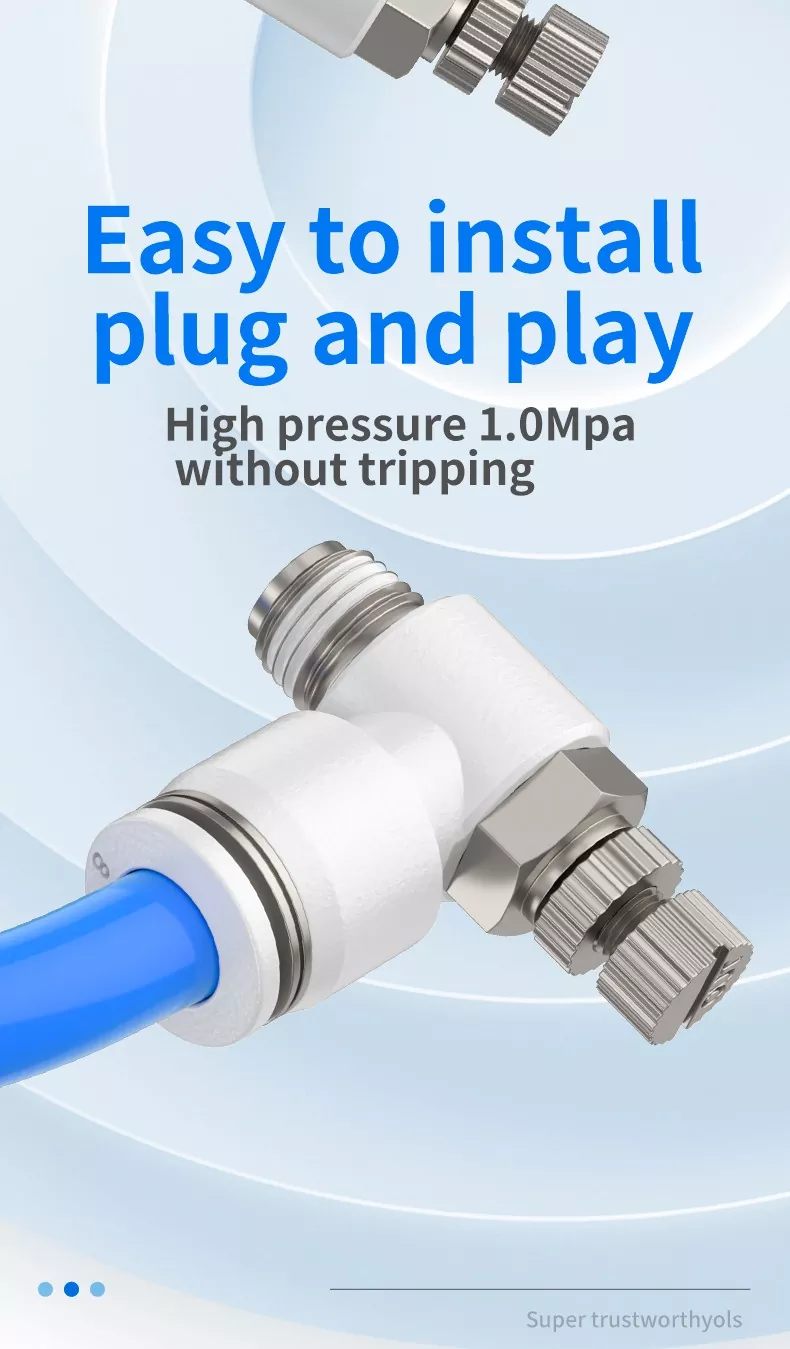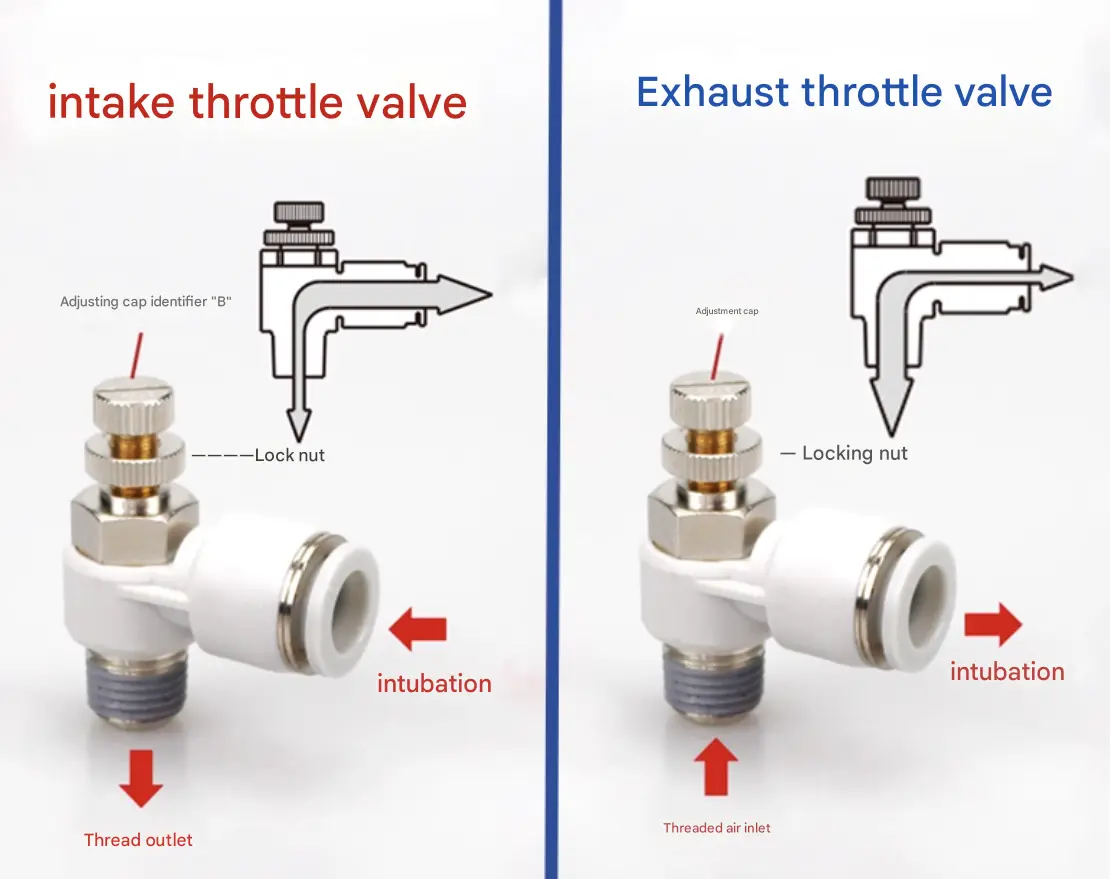 Vstupné škrtiace ventily nasávajú vzduch cez trubicu a výfuk cez závitový port; výfukové škrtiace ventily nasávajú vzduch cez závitový otvor a výfuk cez trubicu.