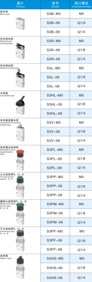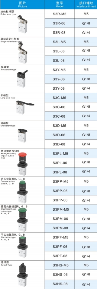 2. S3PF, S3PM, S3PP, S3PL, S3Y, S3HS, S3C, S3D sú ručne prevádzkované a majú rôzne štrukturálne tvary ovládacích hláv pre pohodlné použitie v rôznych podmienkach.