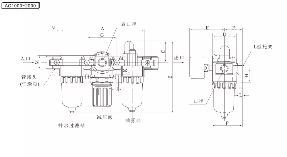 AF (vzduchový filter) + AR (tlakový regulačný ventil) + AL (maznica olejovej hmly) = trojitá jednotka striedavého prúdu